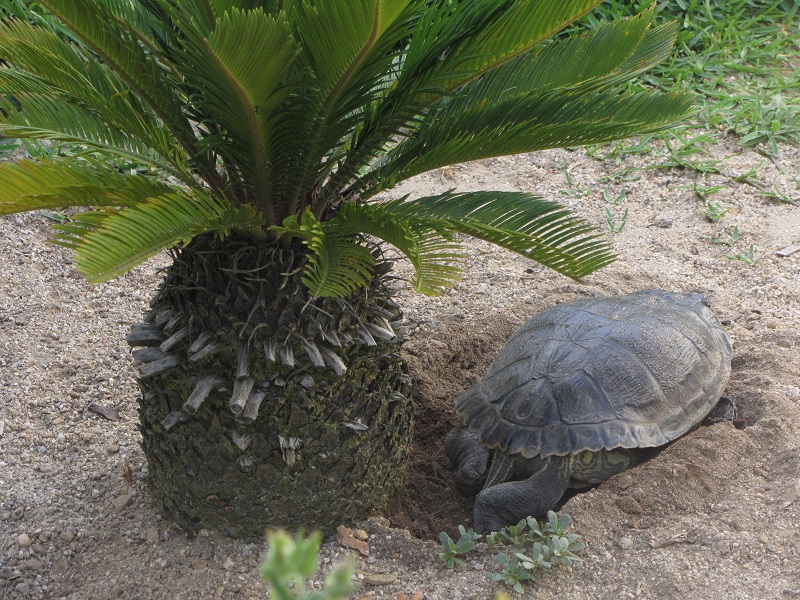 Por vezes as tartarugas decidem cavar nos sítios que menos queríamos que o fizessem, como neste caso em que achou (e tem sido recorrente) que cavar junto às raízes da cyca seria o sítio ideal para colocar os seus ovos. E já me disseram que não é por acaso, que escolhem essas zonas porque retêm melhor a humidade. Ainda assim, eu preferia que o fizessem noutros sítios!